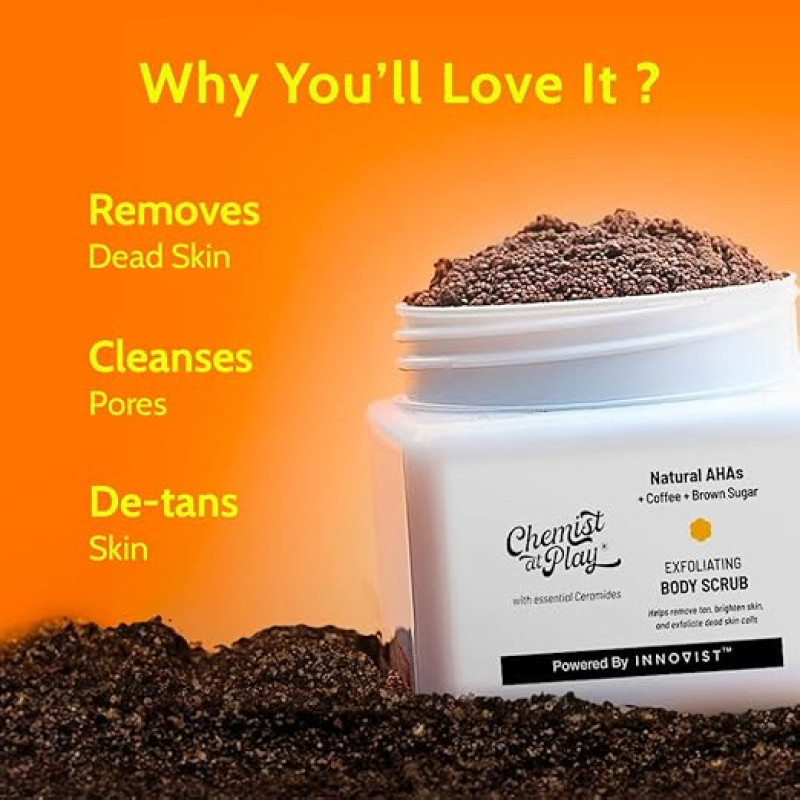 Chemist at Play Exfoliating Body Scrub For Removing Tan & Dead Skin Cells | Rough & Bumpy Skin, Tanned & Pigmented Skin | For Smooth, Soft & Bright Skin | Natural AHAs | Coffee | For Men & Women | 75g
