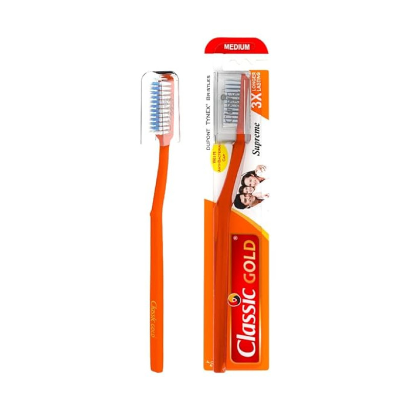 Classic Gold Supreme Medium Manual Toothbrush For Adults | With Dupont Tynex Bristles and Crystal Clear Anti Bacterial Cap | Pack of 12 Pieces - Multicolor