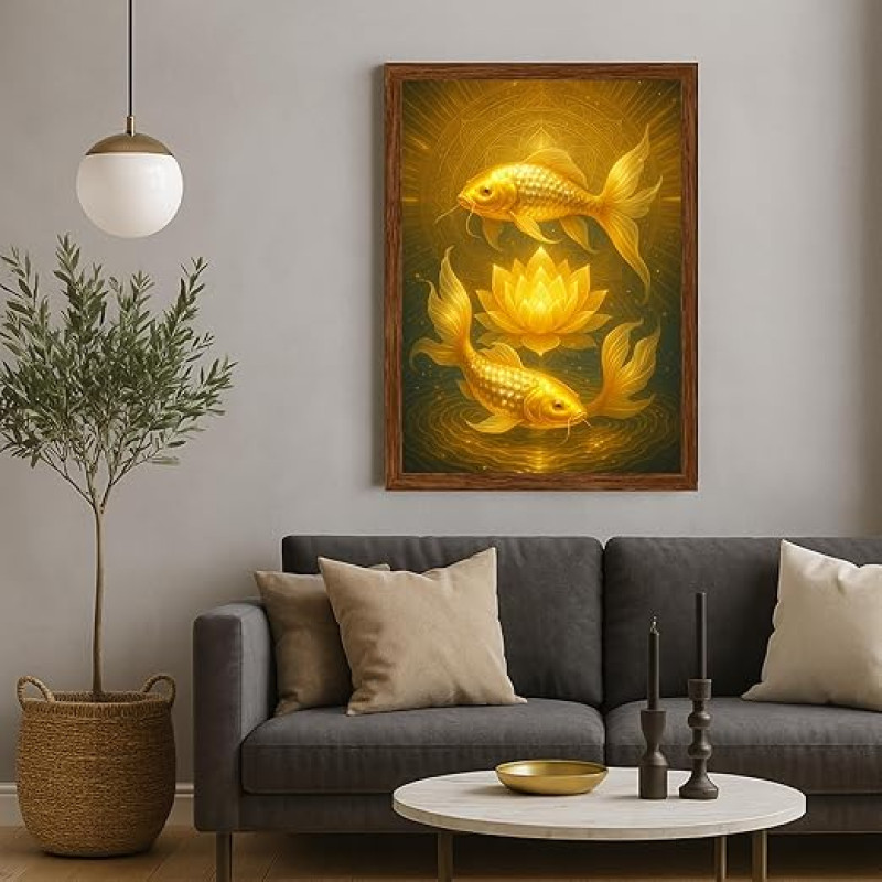 DIVARTH Golden Vastu Fish Wall Painting – Two Koi Fish Feng Shui Art for Positive Energy – Home Temple Office Decor Frame for Wall A4 Photo 10x13 Inch (Brown)
