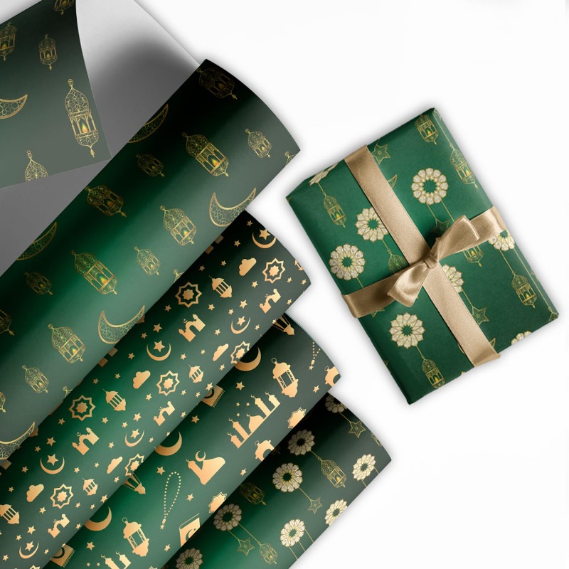 Festiko® Set of 12 Pcs Wrapping Papers for Ramadan/Eid (Green & Golden), Gift Wrapping Paper, Eid Party Supplies