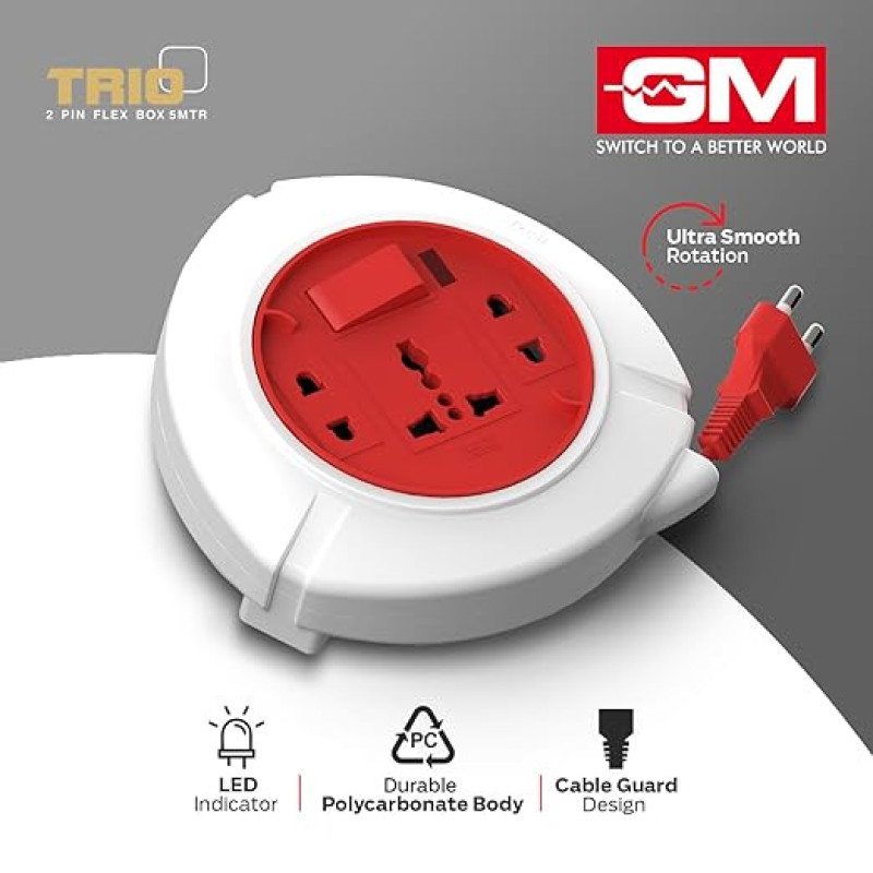 GM 3041 Trio 2-Pin Flex Box with 5M Copper Cord | Universal 3-Pin & 2-Pin Sockets | Master Switch, LED Indicator | Safety Sleeve, Cable Guard, Polycarbonate Body | Home & Office Use