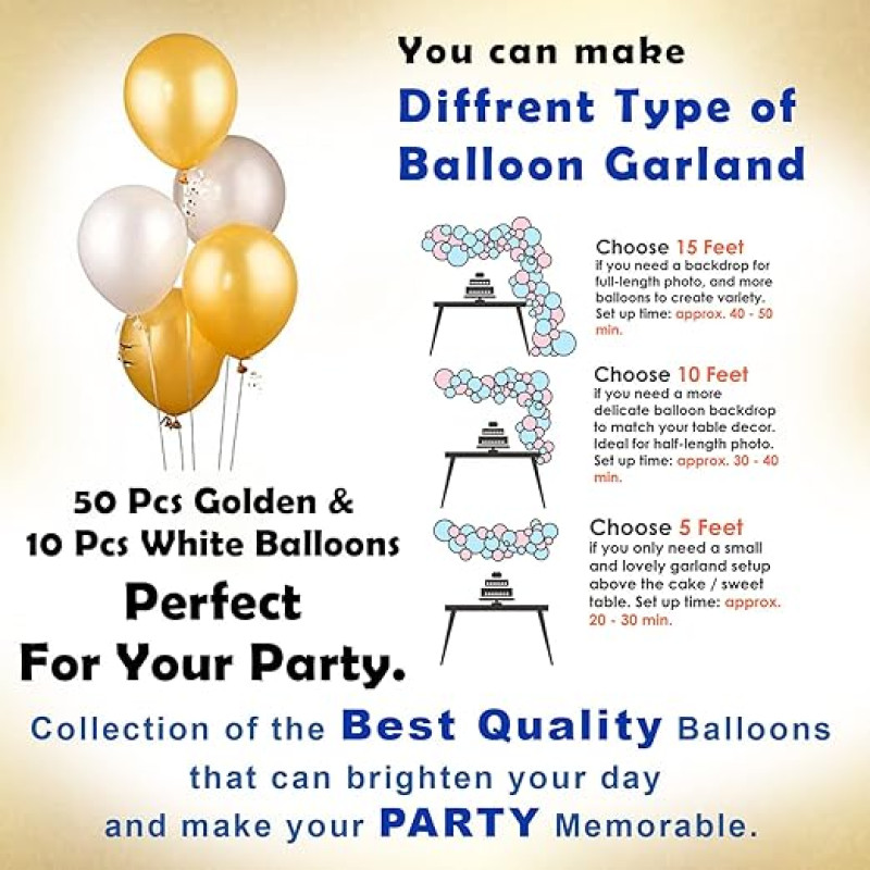 - HAPPY BIRTHDAY DECORATION KIT INCLUDES : 1pc happy birthday golden foil banner, 50pcs white metallic balloon (10-inch), 10pcs golden metallic balloons (10-inch), 2pcs white net curtains, 2pcs hanger, 1pc ribbon for birthday, 1pc balloon arch, 1pc glue dot roll. This white and gold birthday decor looks very pretty in girls bday decorating.