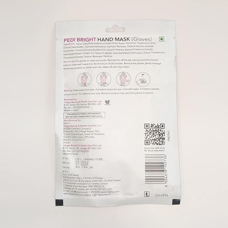O3+ Pedi Bright Hand Gloves Cream Mask | Intensive Moisturising & Brightening Treatment for Soft, Nourished & Healthy-Looking Hands |