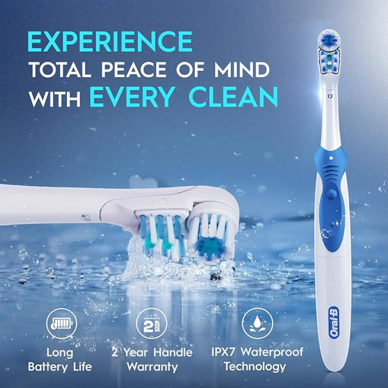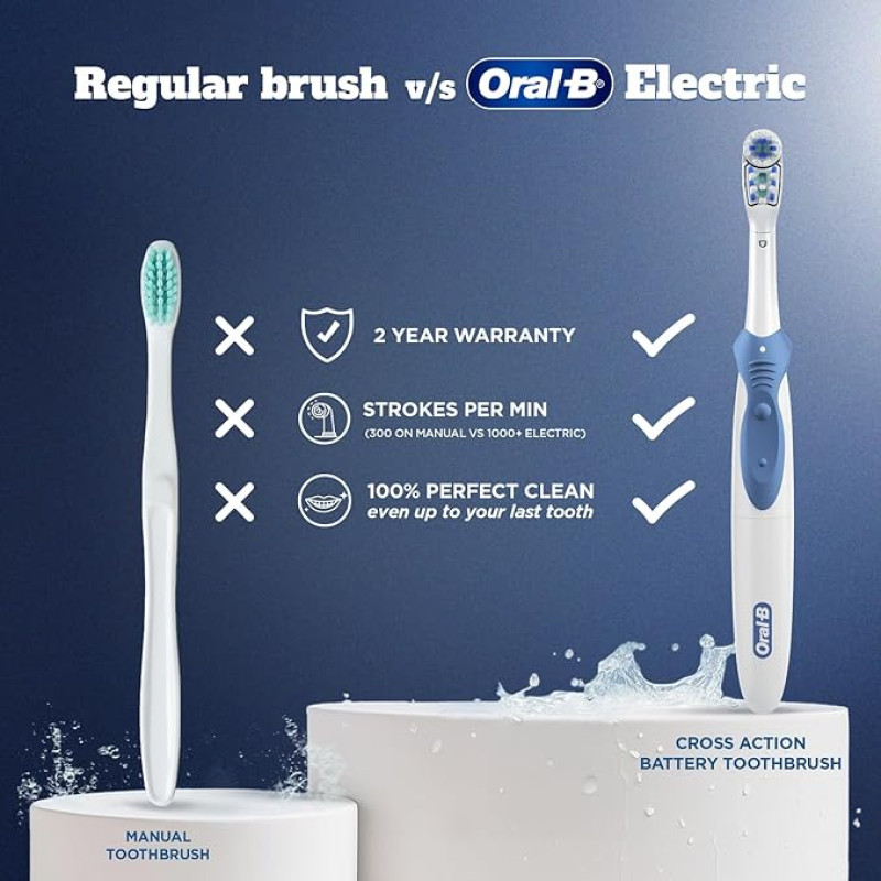 Oral B Cross Action AA Battery Electric Toothbrush for Adults, 90 Day Battery, 2 Year Warranty by Oral-B, IPX7 Water Resistant, Soft Crisscross Bristles (Blue, 1)