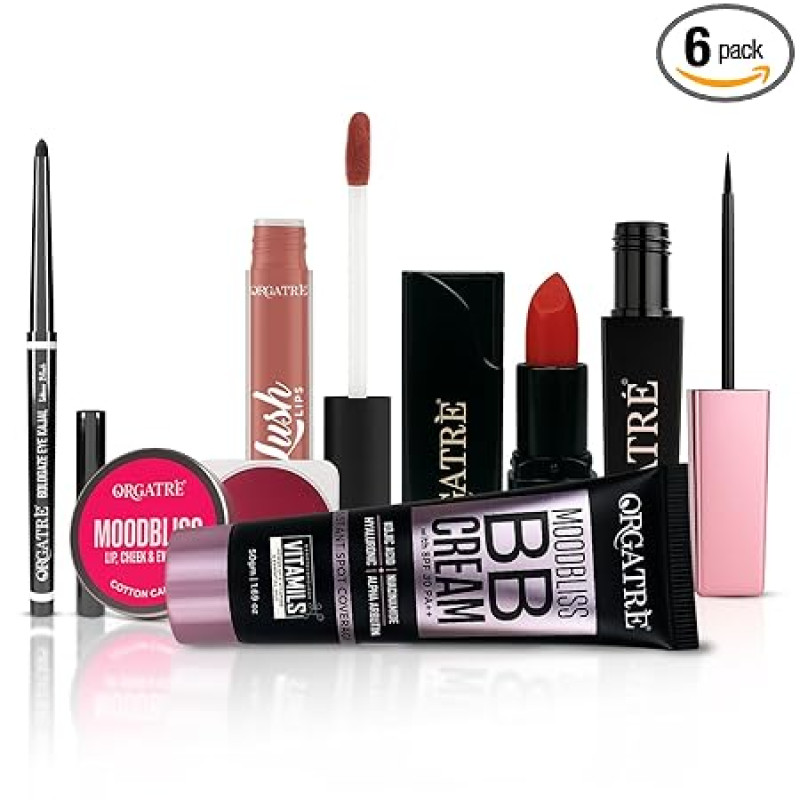Orgatre Festive Gift for her Beauty Makeup Kit set for Gifting – Eye Kajal, Lip & Cheek Tint, Liquid & Bullet Lipstick, MoodBliss Eyeliner, BB Cream – 6-in-1 Festive Makeup Combo for Eyes, Lips & Face