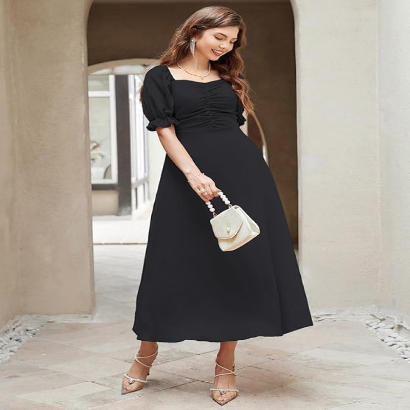 Women's Solid A-Line Ruched Puff Sleeve Maxi Long Evening One Piece Long Dress for Women Stylish (Dress 131)